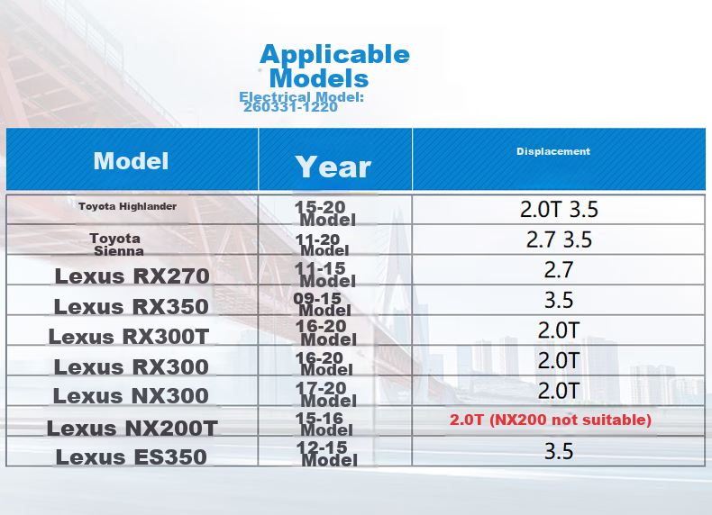 **Compatibility:** Suitable for Toyota Highlander 15-20 (2.0T 3.5), Toyota Sienna 11-20 (2.7 3.5), Lexus RX270 11-15 (2.7), Lexus RX350 09-15 (3.5), Lexus RX300T 16-20 (2.0T), Lexus RX300 16-20 (2.0T), Lexus NX300 17-20 (2.0T), Lexus NX200T 15-16 (2.0T - NX200 not suitable), Lexus ES350 12-15 (3.5)
