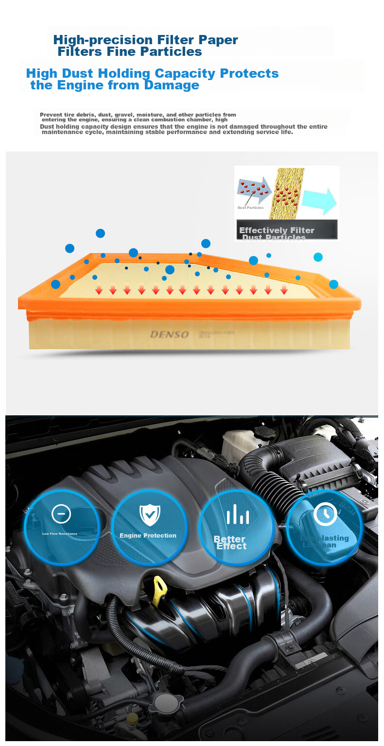 - The DENSO Air Filter provides clean airflow to maintain engine power and longevity. It is meticulously crafted with strong filter paper and high-quality filter materials. The filter offers high filtration precision, protecting the engine by filtering impurities and reducing wear and maintenance costs.