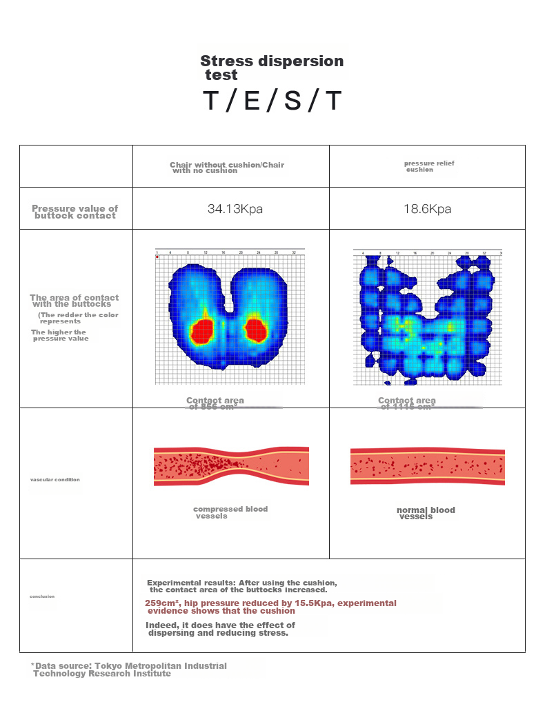 **Blood Vessel Status:** After using the cushion, the contact area of the buttocks increased by 259cm² and the buttock pressure decreased by 15.5Kpa.