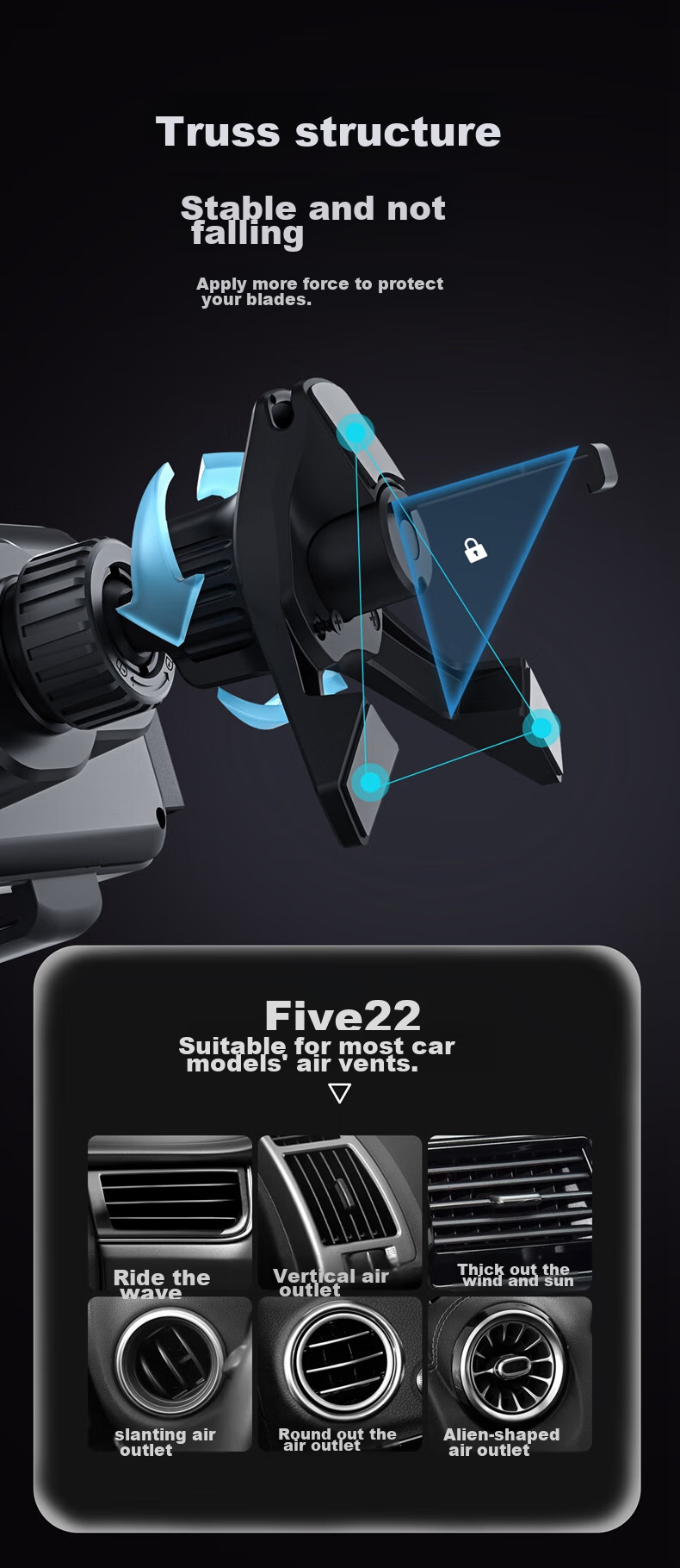 **Mounting:** Triangular mechanical support with multi-point force application for stability and protection. Three-pronged hook clip suitable for various types of car air vents.