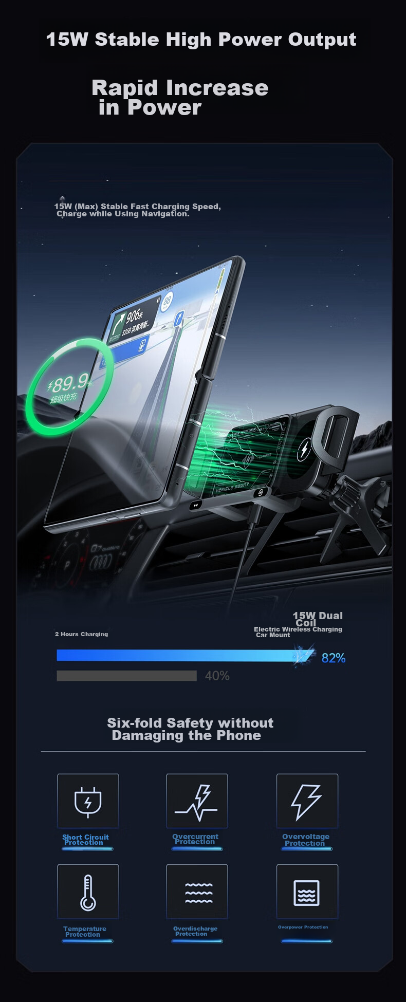 **Charging Speed:** Offers stable 15W high-power output for rapid charging, with a maximum speed of 15W. Allows for charging while using navigation apps.