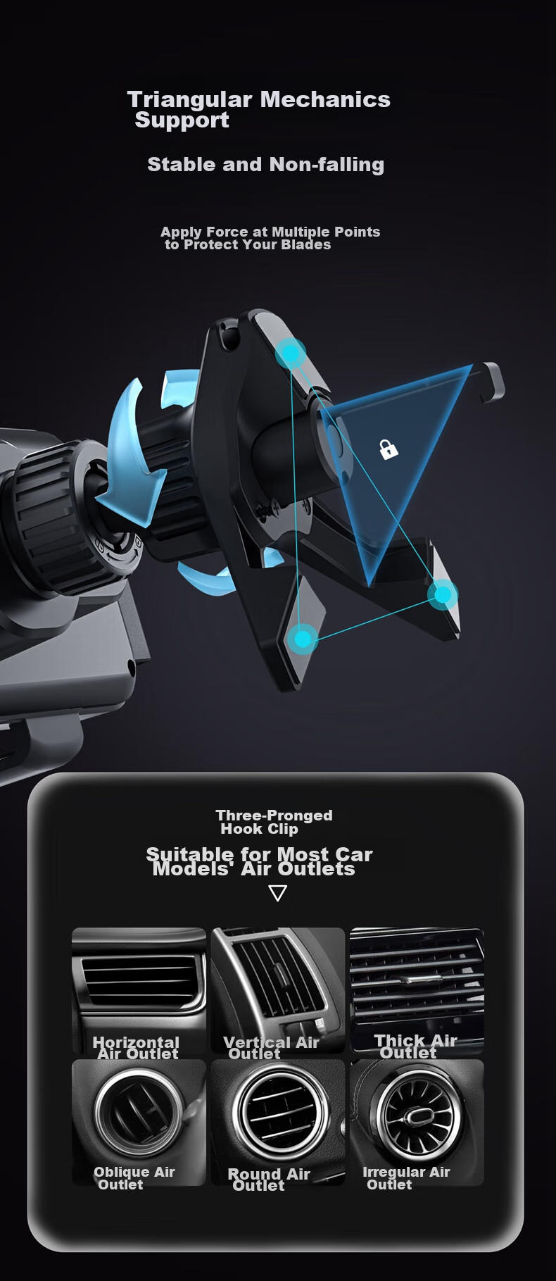 **Compatibility:** Fits most car air vents with a triangular support structure and three-point force application for secure mounting.