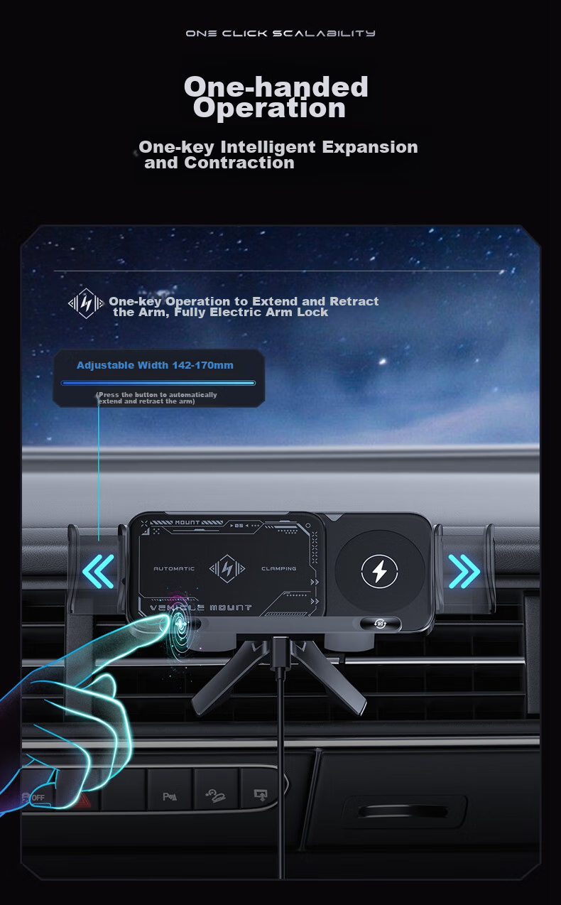 **Scalability:** One-click smart telescopic arm operation for adjusting the width from 142mm to 170mm.