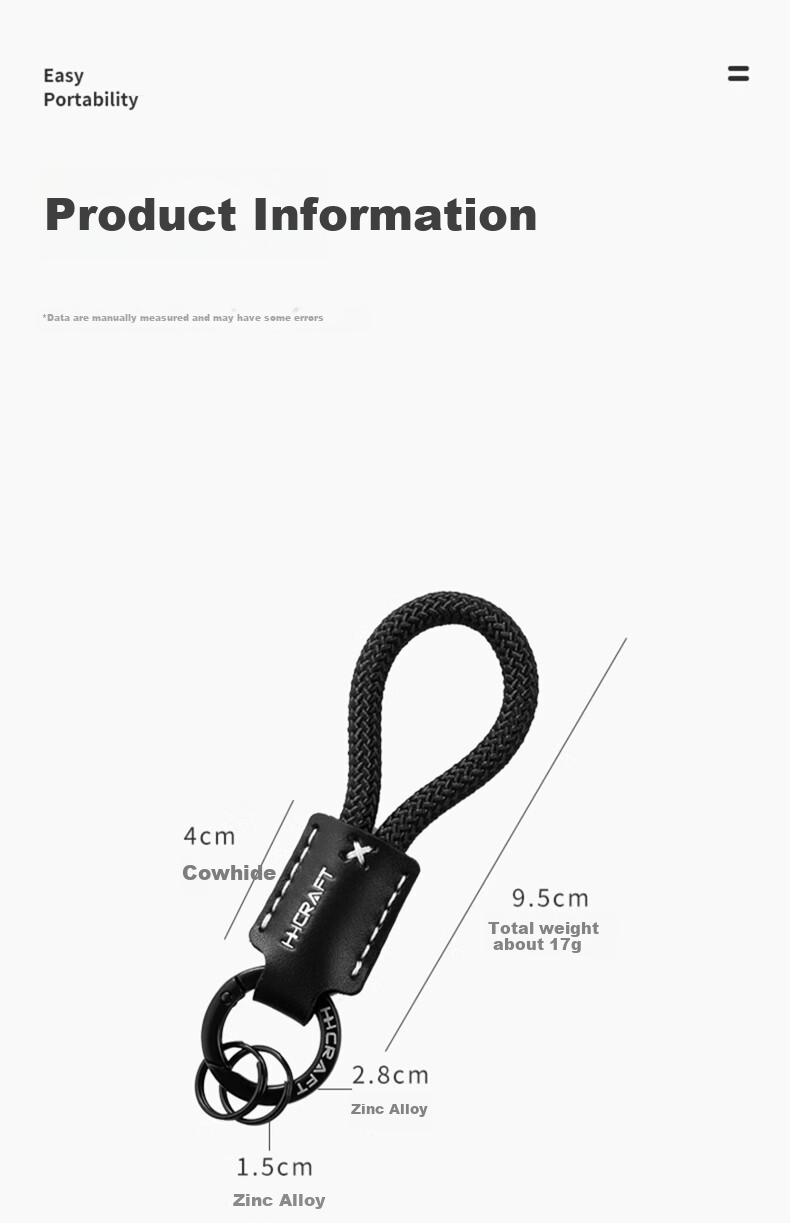 Dimensions: 4cm (cowhide), 9.5cm (total length), 17g (total weight), 2.8cm (zinc alloy), 1.5cm (zinc alloy)