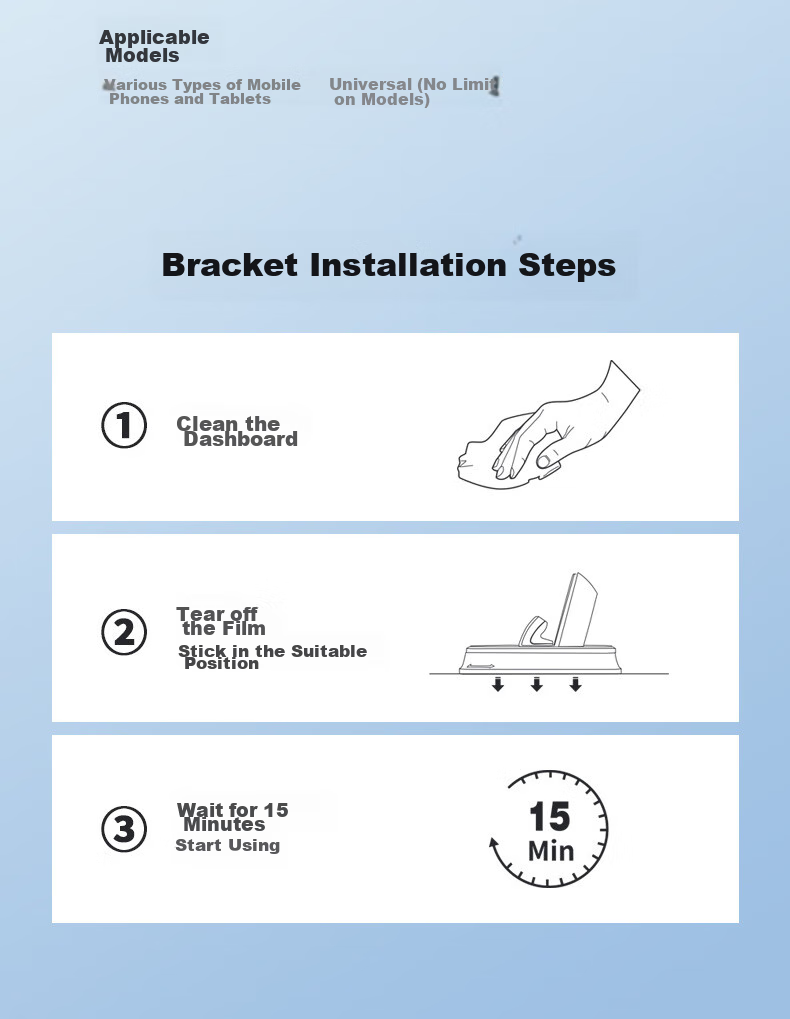 - Installation Method: Clean the dashboard, peel off the film, stick in the appropriate position, wait for 15 minutes, and start using