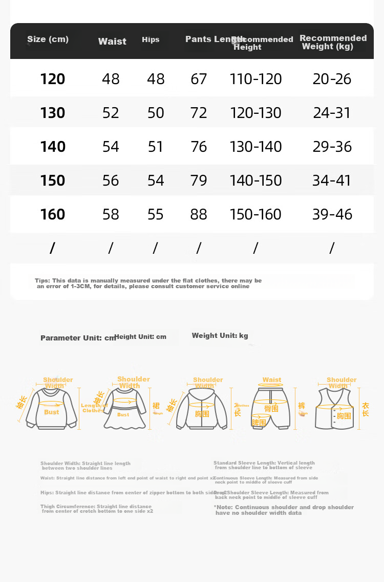 *Note: Measurements are taken manually with clothes laid flat, and may have a 1-3cm error. For more details, please consult customer service.*