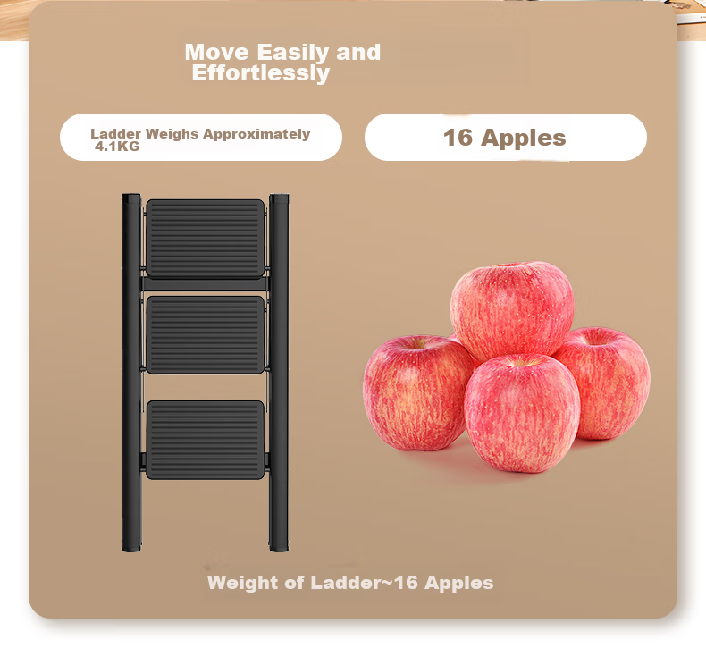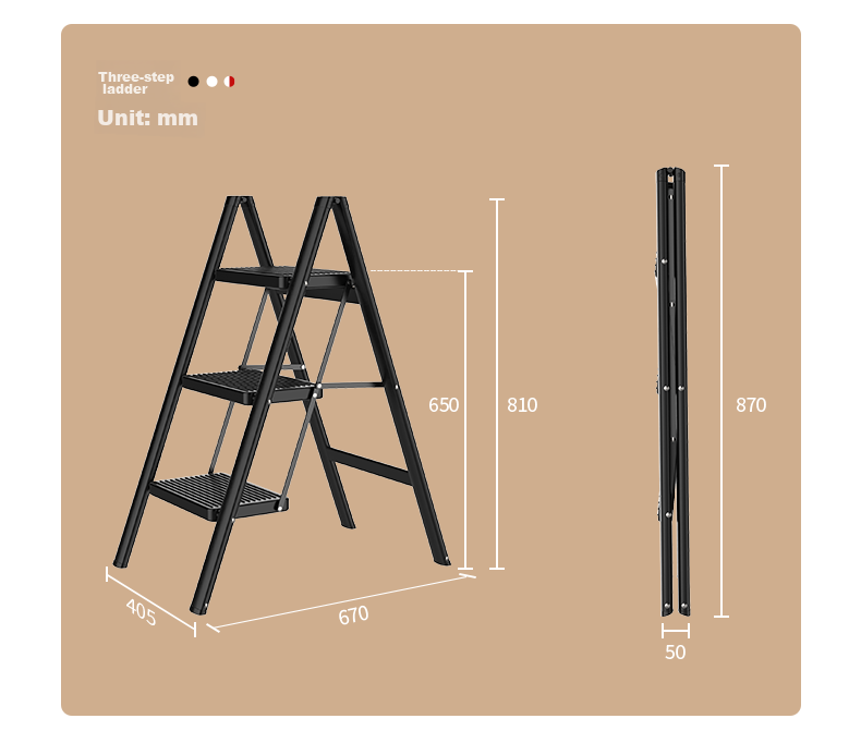 - Three-step ladder: 650mm (height), 810mm (width), 870mm (depth)