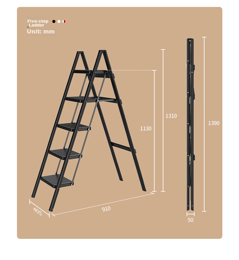 - Five-step ladder: 1310mm (height), 1390mm (width), 1130mm (depth)