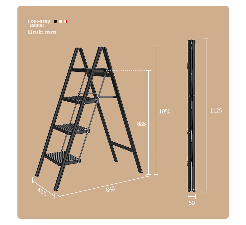 - Four-step ladder: 1050mm (height), 1125mm (width), 885mm (depth)