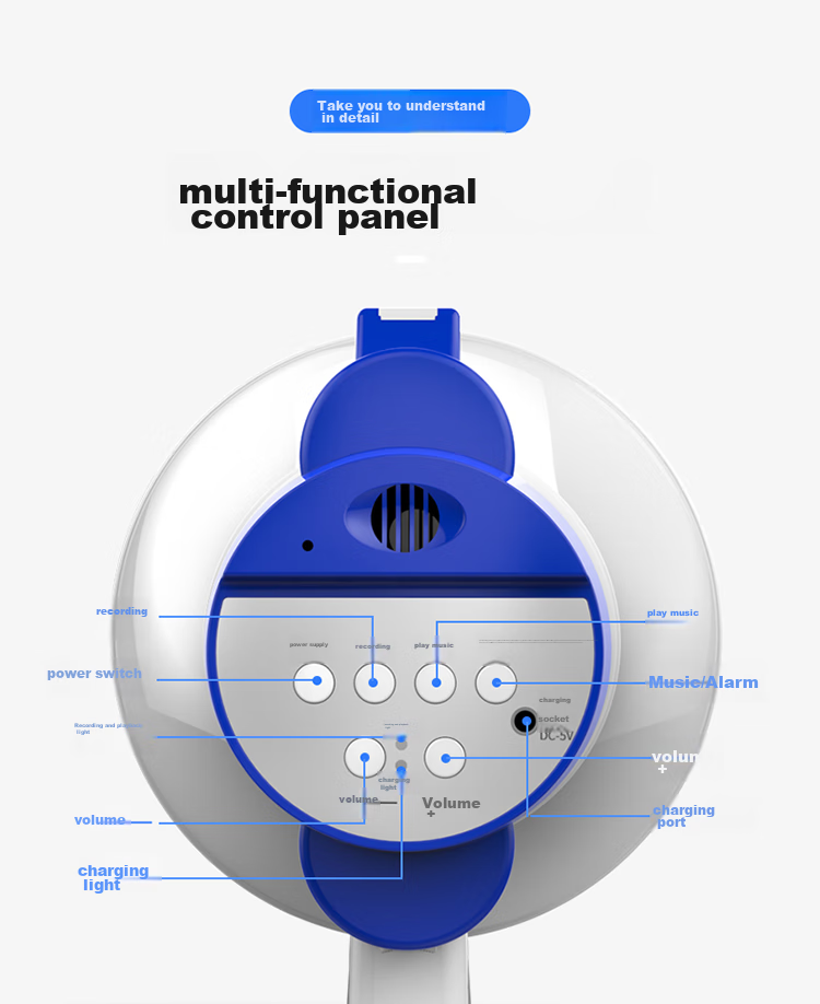 Control Panel: Multi-functional control panel for recording, playback, power, music/alarm, power switch, charging, recording/playback indicator, DC-5V input, volume control, charging indicator