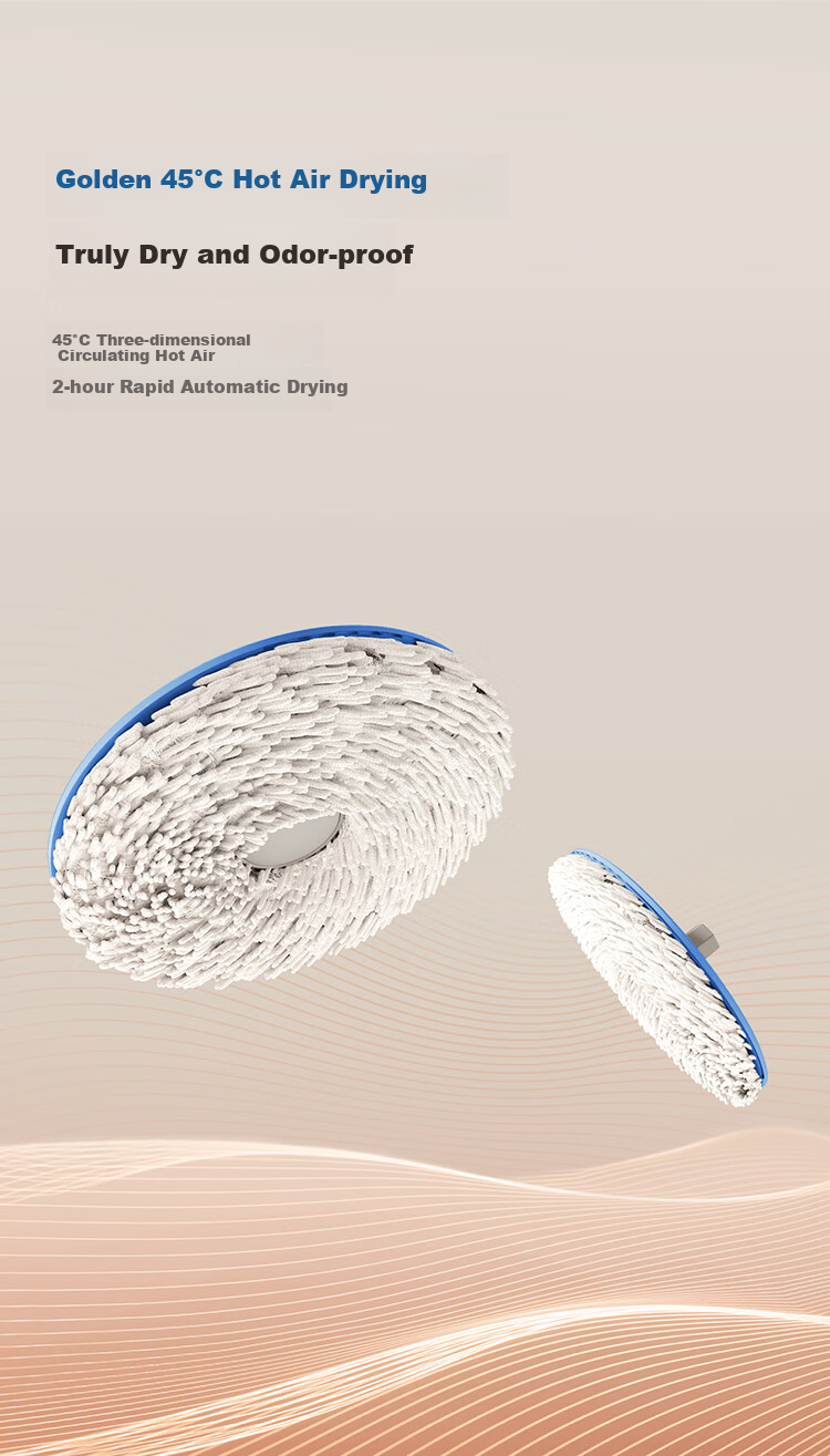 **Quick-Drying:** Utilizes 45°C hot air circulation for rapid drying of the mopping cloth.