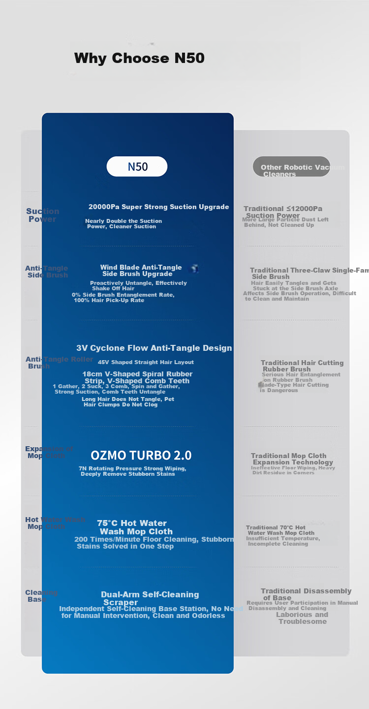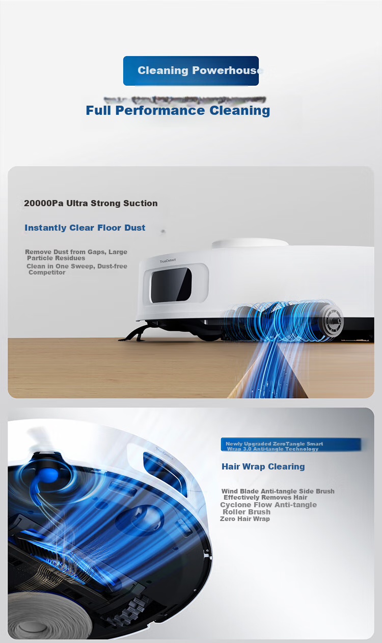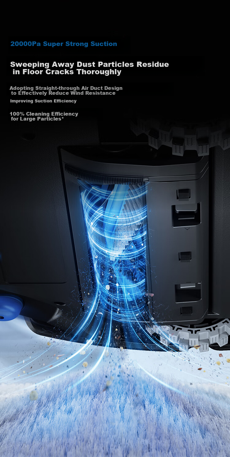 **Suction Power:** 20000Pa, upgraded from traditional ≤12000Pa suction, providing nearly double the suction power for a cleaner result.