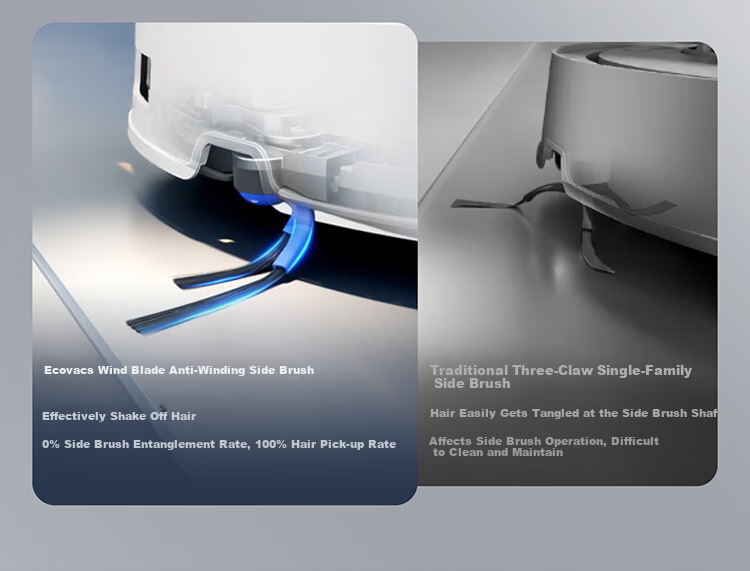**Anti-Tangle Design:** Wind blade anti-tangle side brush prevents hair from getting stuck, with a 0% hair wrap rate and 100% hair pick-up rate.