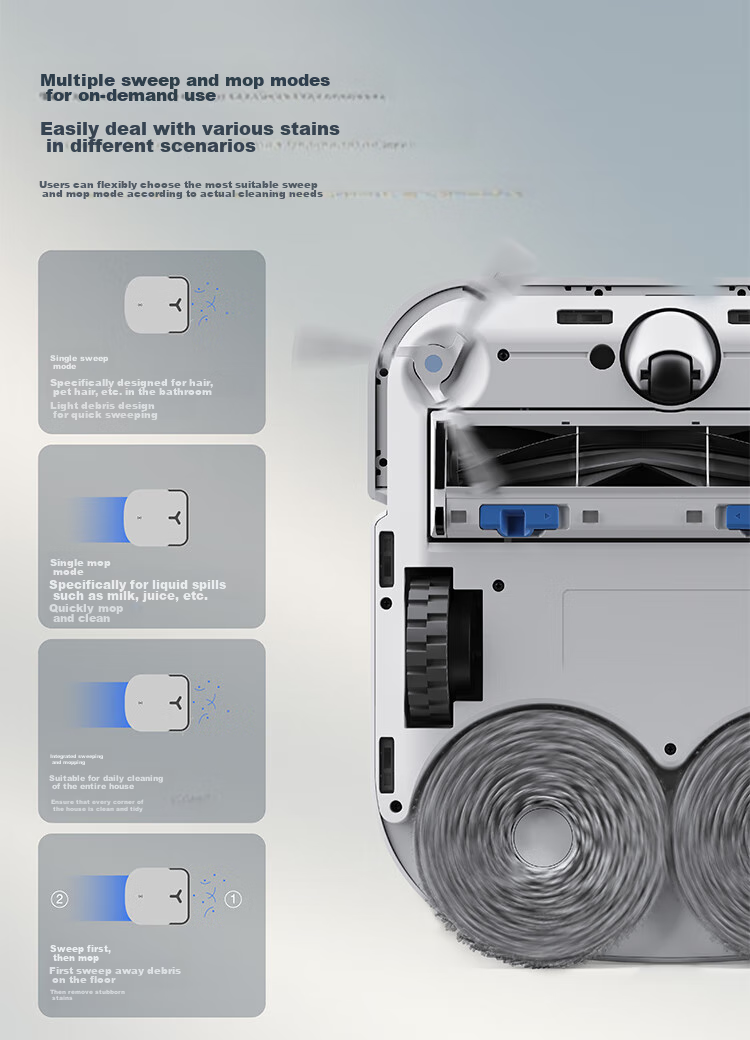**Cleaning Modes:** Offers multiple cleaning modes for different scenarios, including pet-friendly cleaning and targeted stain removal.
