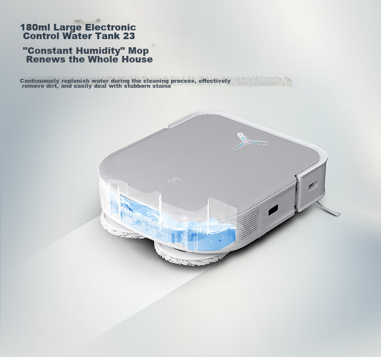 **Mopping:** Features a 180ml electrically controlled water tank for continuous mopping, ensuring thorough cleaning and stain removal.