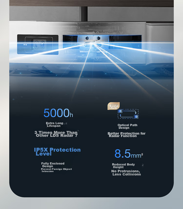 **Laser Technology:** Hybrid solid-state laser radar for precise home mapping and efficient cleaning. Improved scanning accuracy with 5000n solid-state laser radar, covering all corners and edges with high efficiency.