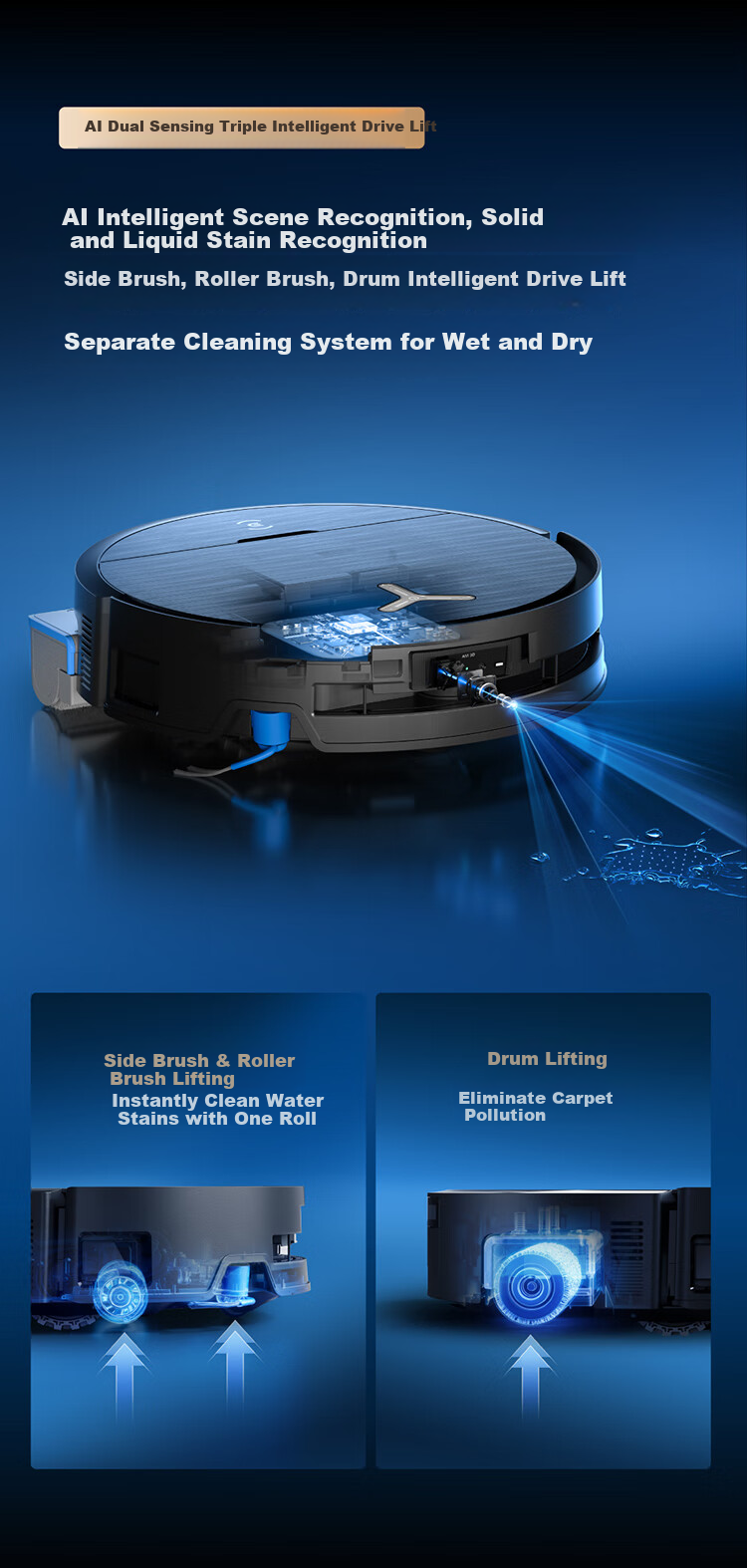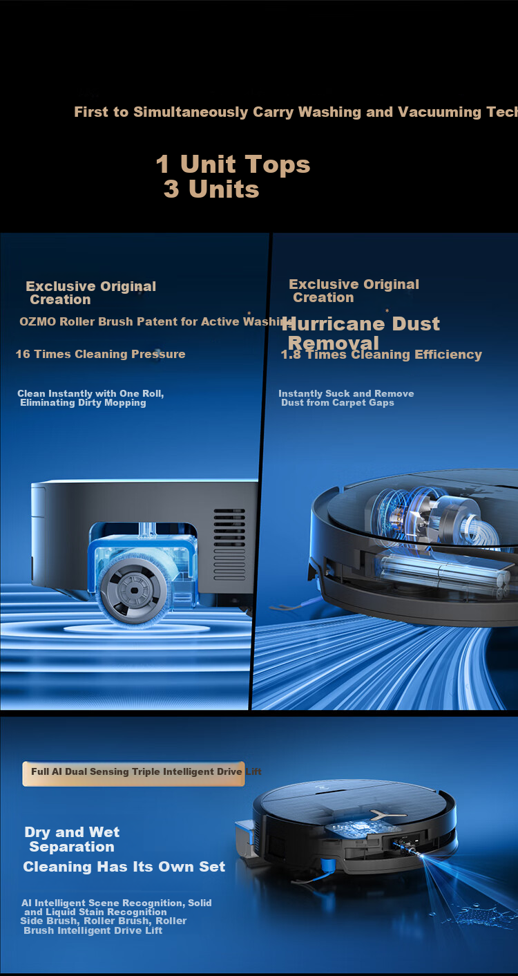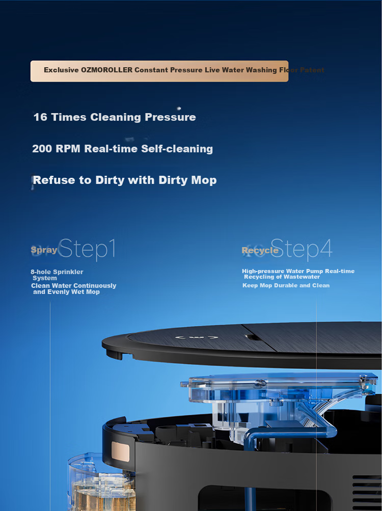 **Innovative Features:** Includes OZMOROLLER constant pressure water washing technology, high-performance sensors for precise navigation, and AI recognition for different types of stains and surfaces.