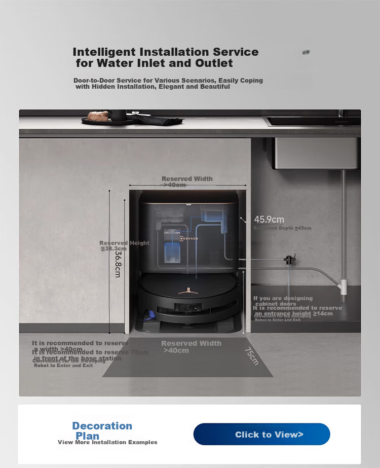 **Installation Services:** Intelligent top-down water installation service, suitable for various scenarios with elegant and hidden installation. Recommended reserved width >40cm, depth ≥49cm, height ≥38.3cm. For cabinet door design, suggest a reserved entrance height ≥14cm and width >40cm. Front of the base station should have a recommended reserved space of 75cm.