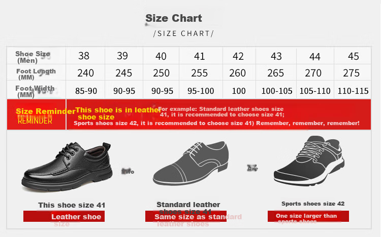 Reminder: This shoe is in leather shoe size. For example, if you wear a standard leather shoe size 41, it is recommended to choose size 41. If you wear a sports shoe size 42, it is recommended to choose size 41.