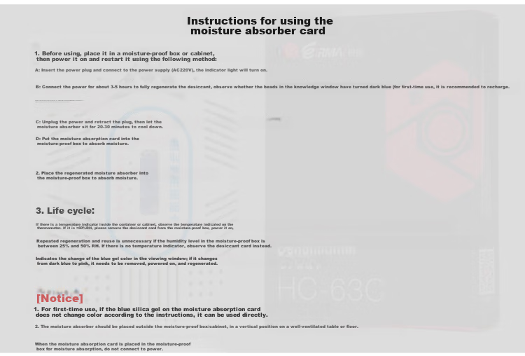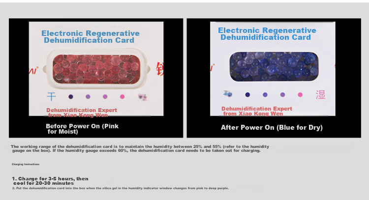 Usage: Place in moisture-proof box or cabinet, follow charging instructions for regeneration