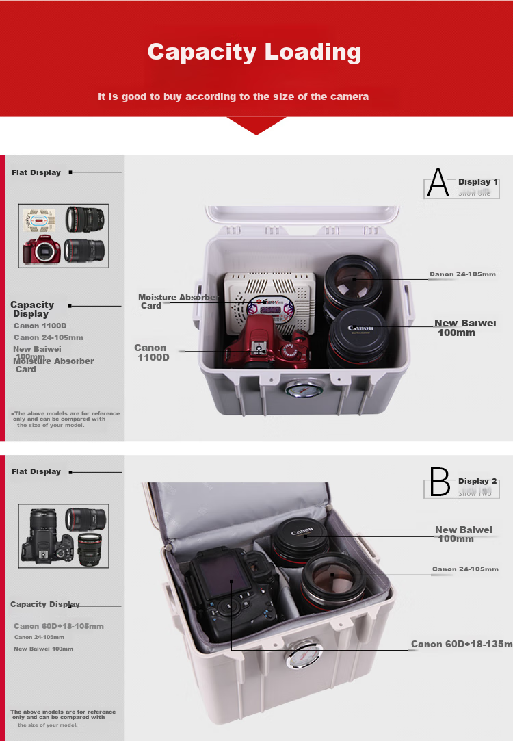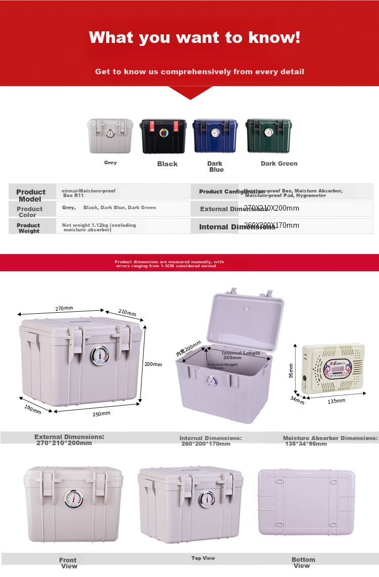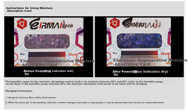 **Moisture Absorber Usage:** The moisture absorber changes color from pink (wet) to blue (dry) when charged, maintaining humidity between 25%-55%. Recharge for 3-5 hours until the silica gel changes color to deep purple for dehumidification.