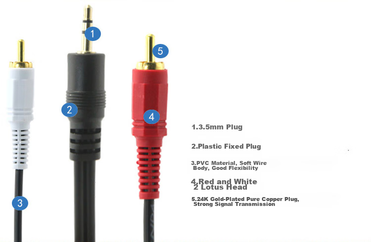 Connector: 3.5mm plug, plastic fixed plug, red and white 2 lotus head, 24K gold-plated pure copper plug