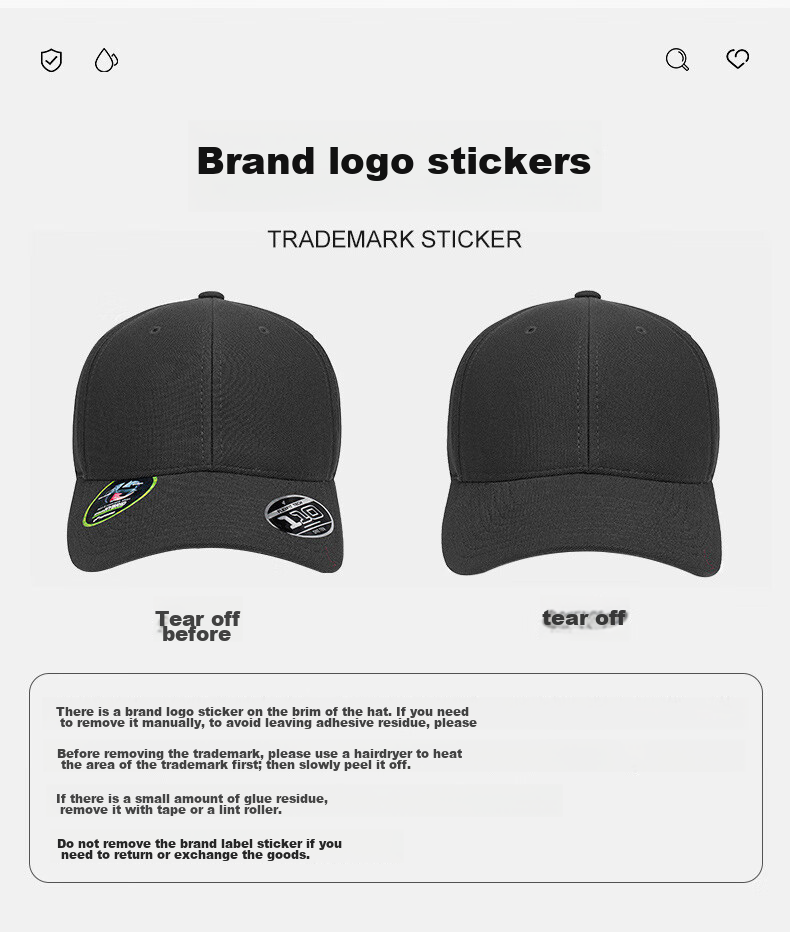 Trademark sticker: Removable with caution to avoid residue, use a hairdryer to heat before removal, do not remove if planning to return or exchange