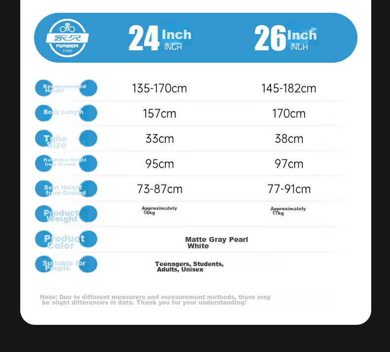 **Wheel Size:** 24 inches (recommended height: 135-170cm), 26 inches (recommended height: 145-182cm)