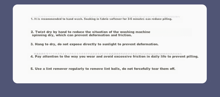 1. Hand wash recommended, soak with fabric softener for 3-5 minutes to reduce pilling