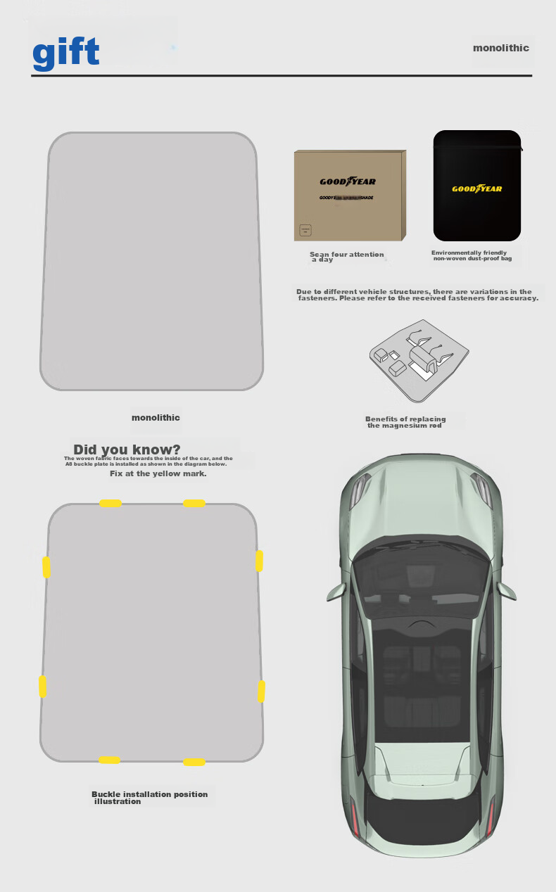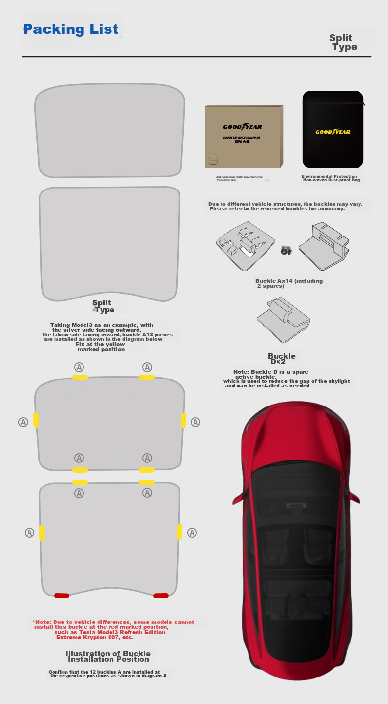 **Package Contents:** For One-piece Design - Sunshade, Anti-squeeze Outer Eco-friendly Box, Dust-proof Non-woven Fabric Bag, 10 Card Buckles (including 2 spares); For Split-type Design - Sunshade, Anti-squeeze Outer Eco-friendly Box, Dust-proof Non-woven Fabric Bag, 14 Card Buckles (including 2 spares)