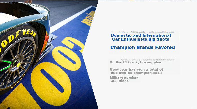 **Champion Brand:** Preferred by car enthusiasts and professional drivers, Goodyear has been a leading tire supplier in Formula 1 racing, winning numerous championships.