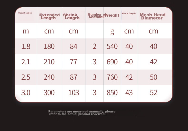 - Extended length, retracted length, number of sections, weight, net depth, net head diameter.