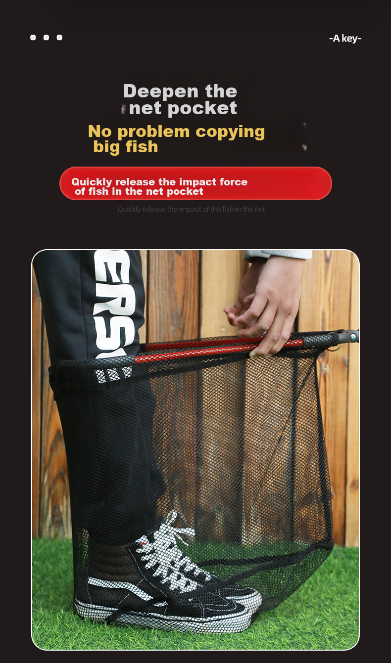 Akey: deepened net pocket for catching large fish, quickly release the impact of fish in the net.
