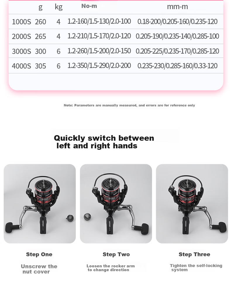 **Parameters:** Weight, PE, Nylon, line capacity, gear ratio, bearing number