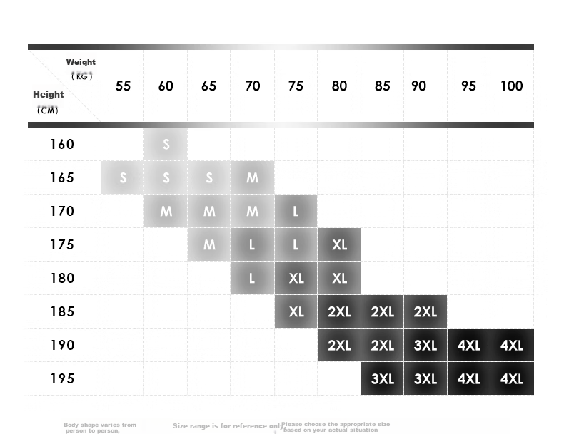 **Height (CM):** 160 (S), 165 (S), 170 (S, M), 175 (M, L), 180 (XL), 185 (XL, 2XL), 190 (2XL, 3XL, 4XL), 195 (3XL, 4XL)