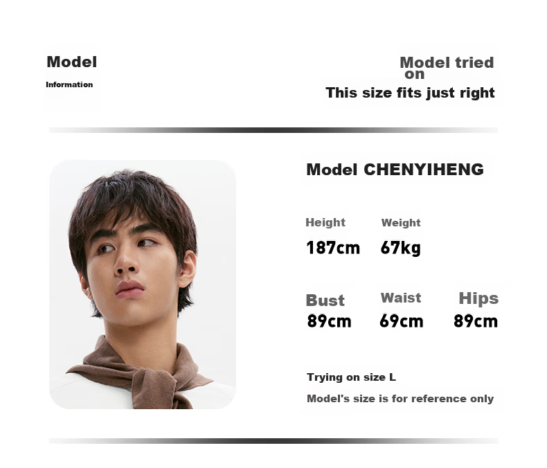 - **Model's Measurements:** Height 187cm, Weight 67kg, Chest 89cm, Waist 69cm, Hips 89cm