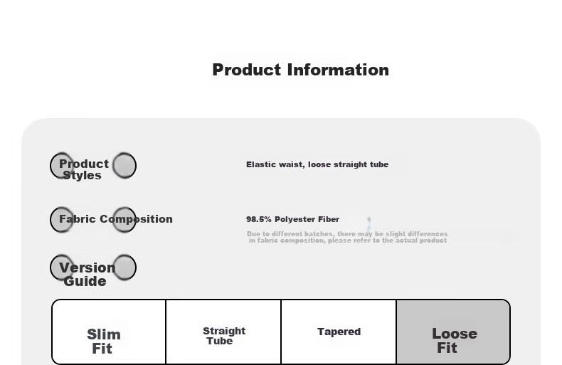 Fabric Composition: 98.5% polyester fiber (slight variations in fabric composition due to different batches, please refer to actual product for details)