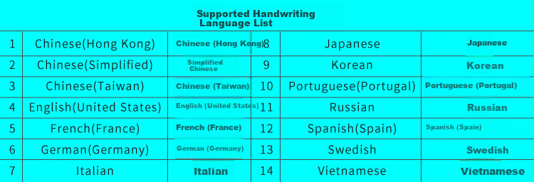 - Supports handwriting recognition for 14 languages