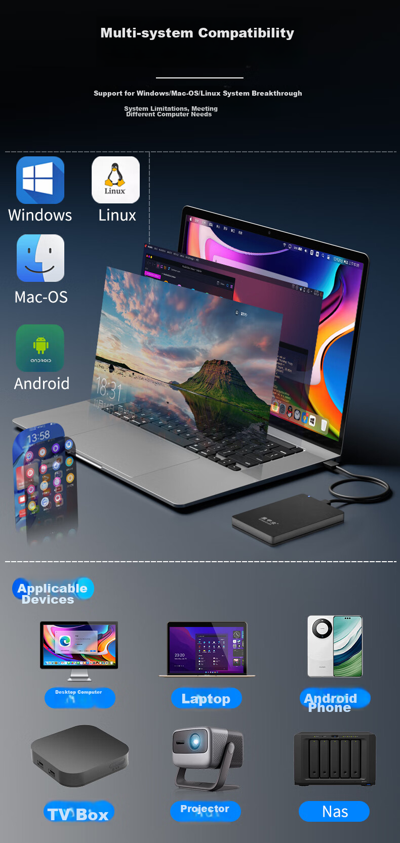 Supports multiple systems including Windows, Mac-OS, Linux, and Android