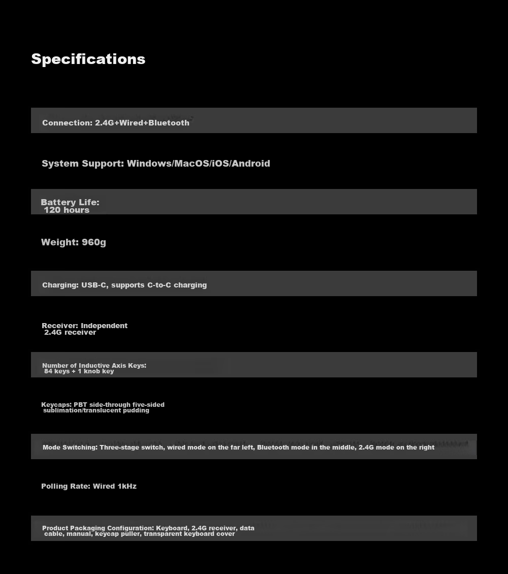 **Compatibility:** Windows/MacOS/iOS/Android support, USB-C charging, 2.4G receiver, 84 keys + 1 knob, PBT translucent keycaps, three-mode switch, 1kHz wired polling rate