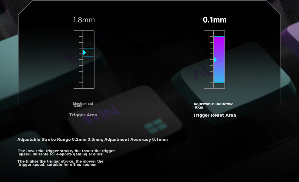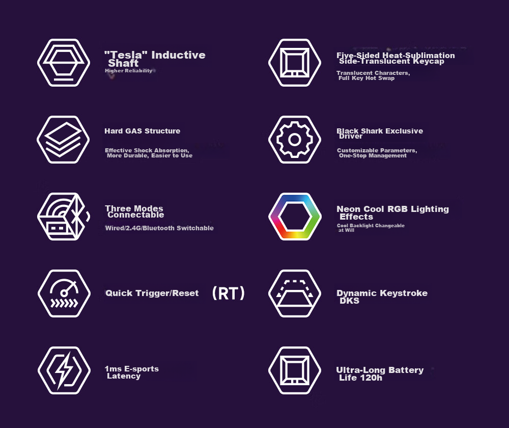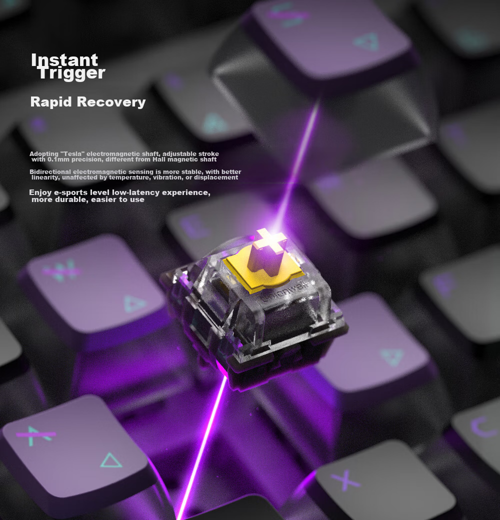 **Switch Type:** Global debut of "Tesla" inductive switch, "Tesla" inductive switch with hard Gas structure for 0.1mm RT precise control, full key customizable key travel in three modes