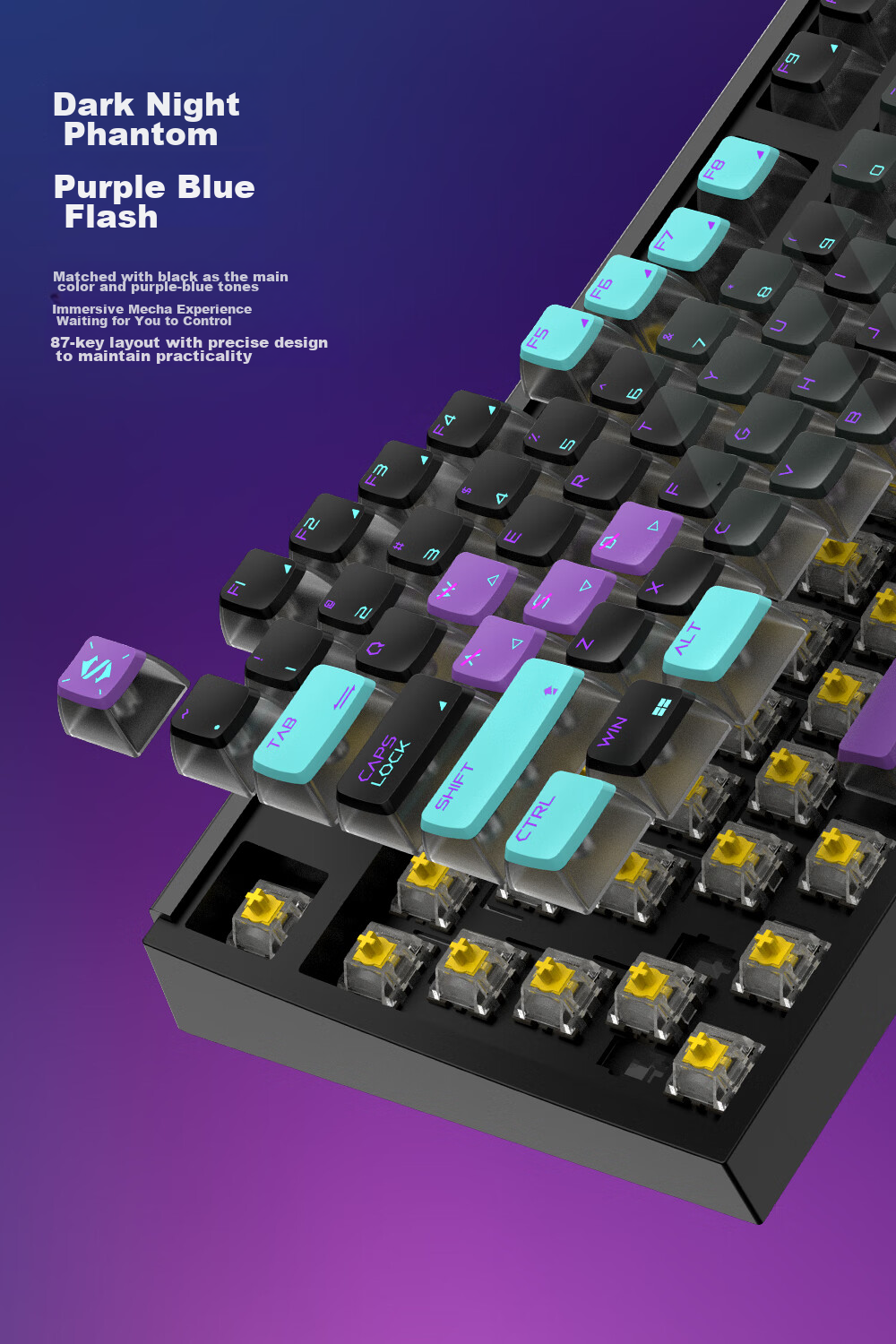 **Appearance:** Black base with purple-blue accents, 87-key layout for practicality