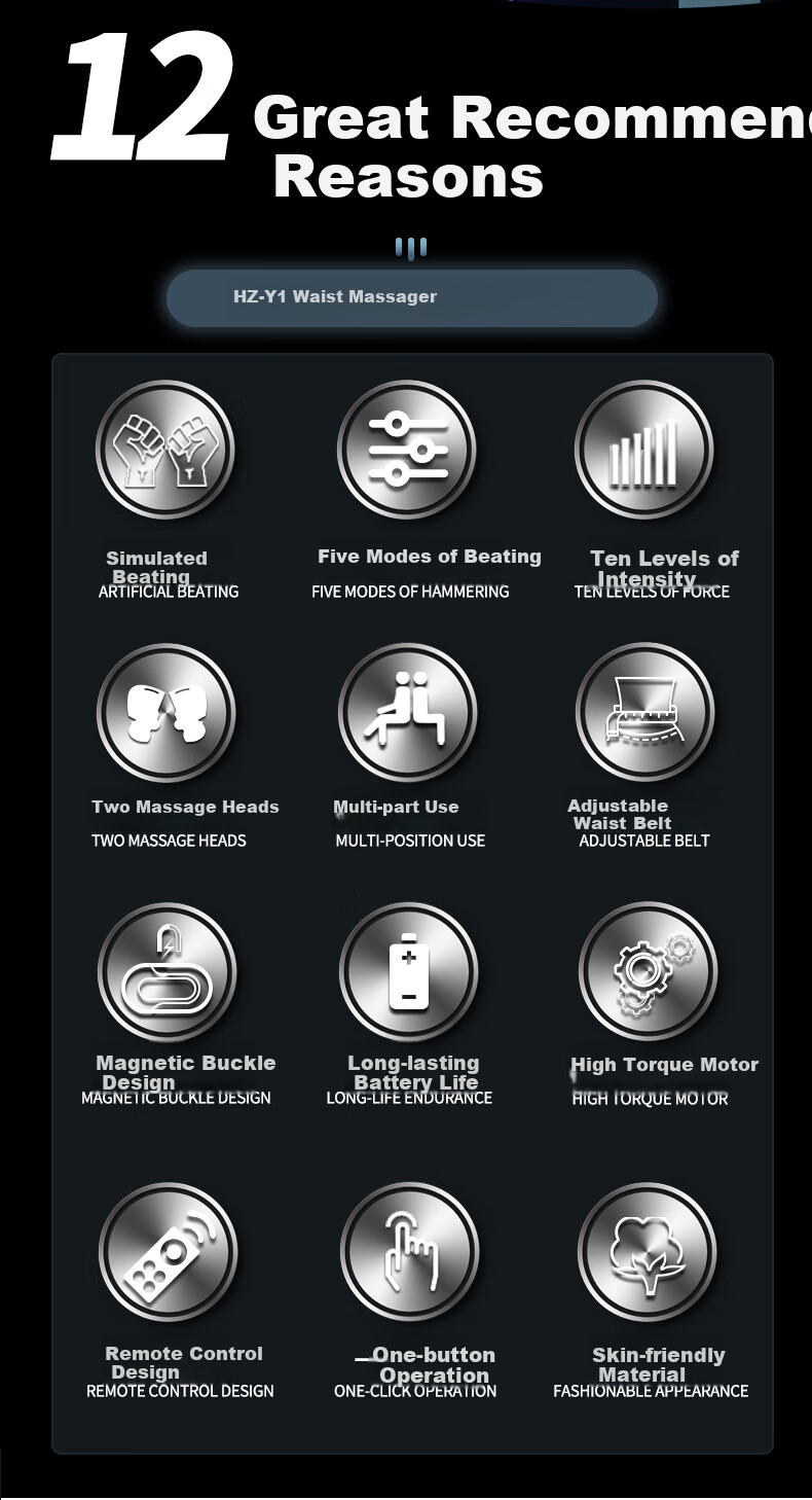 **Description:** Hezheng HZ-Y1 Waist Massager provides a new definition of manual beating massage, offering a refreshing experience for the waist. It features 12 key selling points including artificial beating, five modes of hammering, ten levels of force, two massage heads, multi-position use, adjustable belt, magnetic buckle design, long-life endurance, high torque motor, remote control design, one-click operation, and fashionable appearance.