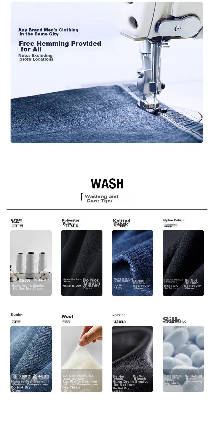 - For denim, wool, leather, and silk: Dry clean only, do not bleach, iron at low temperature