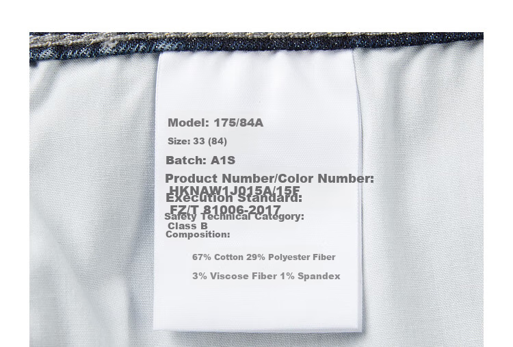 Size: 175/84A, Size: 33 (84), Batch: A1S, Item/Color Number: HKNAW1J015A/15F, Executive Standard: FZ/T 81006-2017, Safety Technical Category: Class B, Composition: 67% cotton, 29% polyester fiber, 3% viscose fiber, 1% spandex.