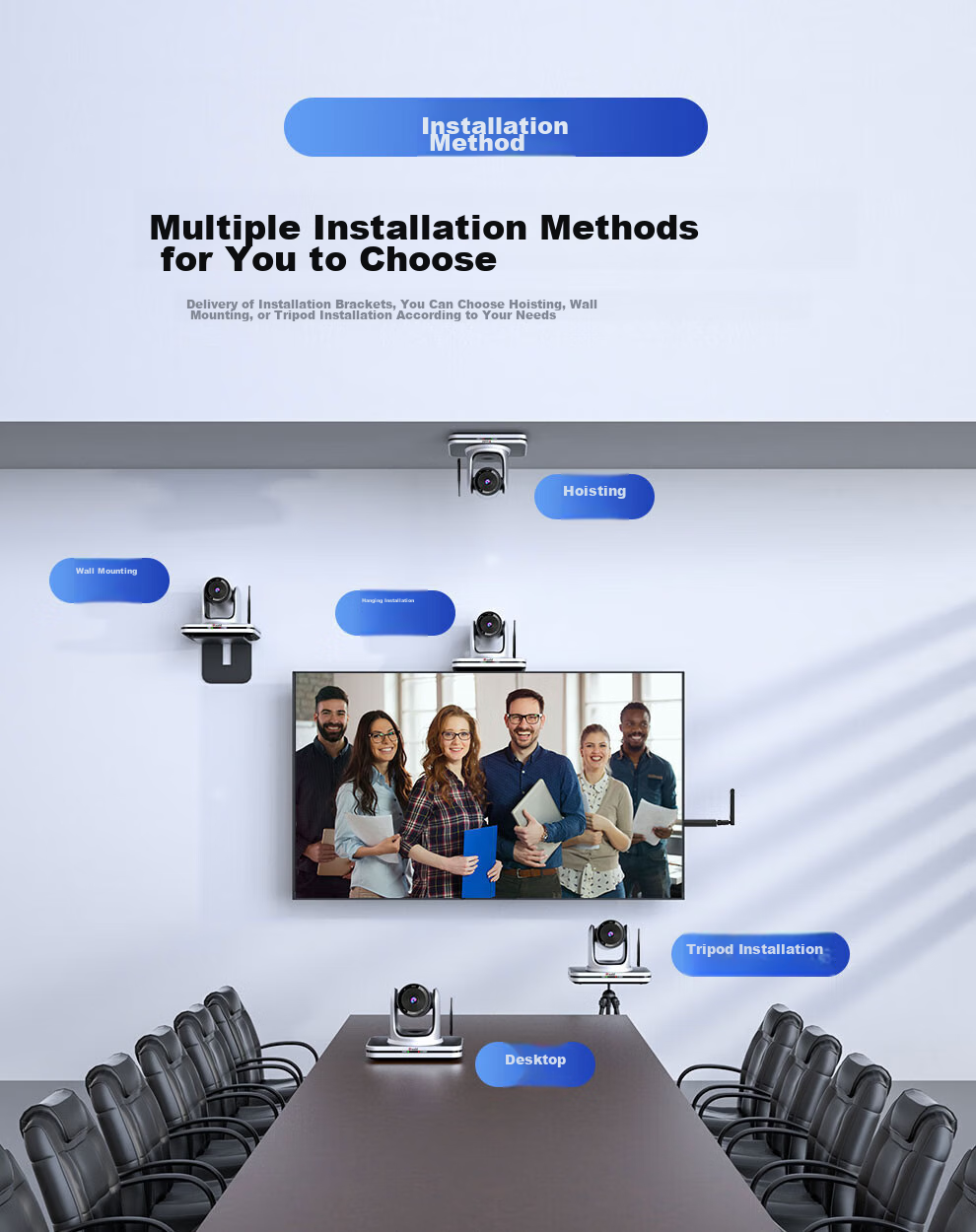 **Installation:** Multiple installation options available including hanging, wall mounting, tripod mounting, hanging, wall mounting, hanging, tripod mounting, desktop.