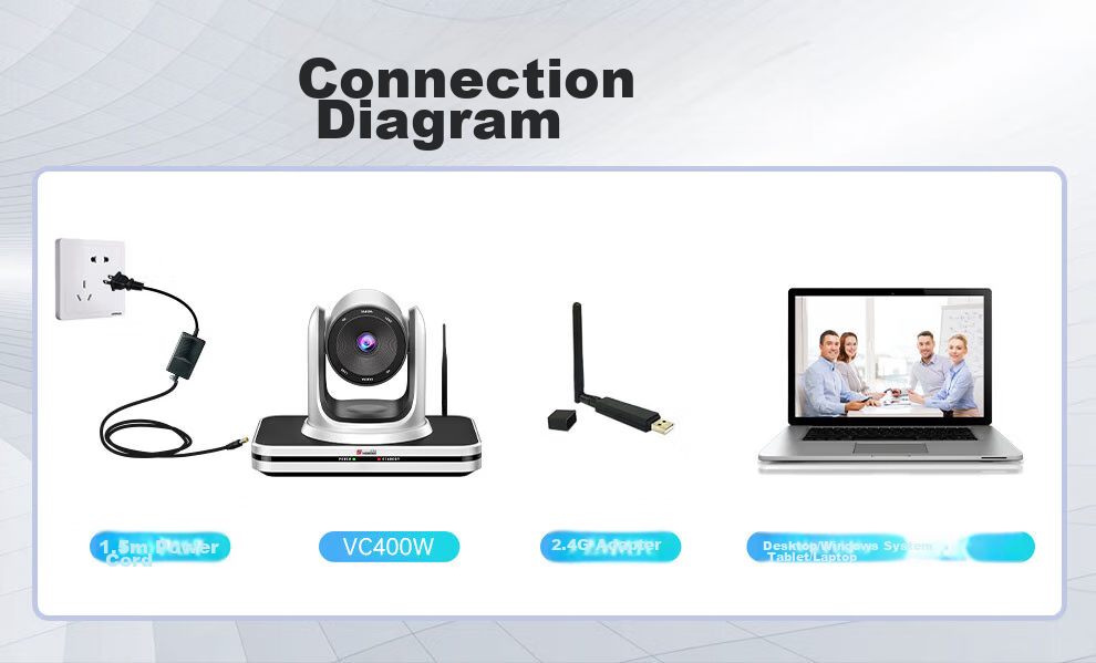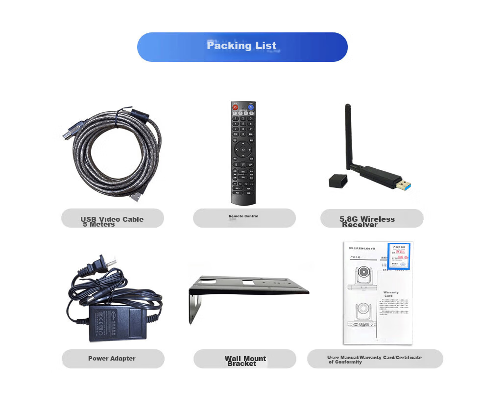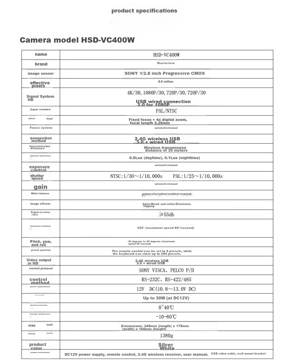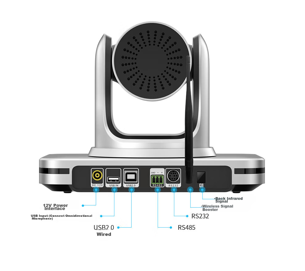 **Description:** 4K Wireless HD Camera with Fixed Focus + 4x Digital Zoom/2.4G Wireless/850W Pixels/Video Conferencing Solution/Software System Hard Terminal Equipment. Dual USB interfaces for connecting omnidirectional microphones.