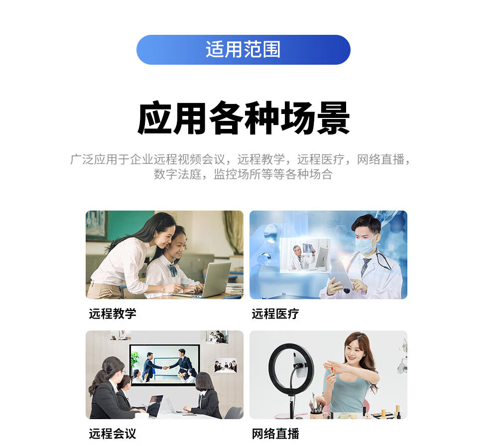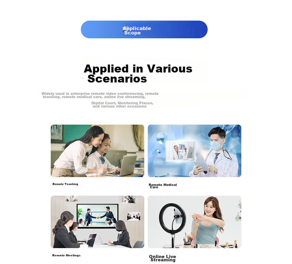 **Applications:** Widely used in various scenarios including enterprise remote video conferencing, remote teaching, remote medical care, online streaming, digital court, surveillance locations, etc.