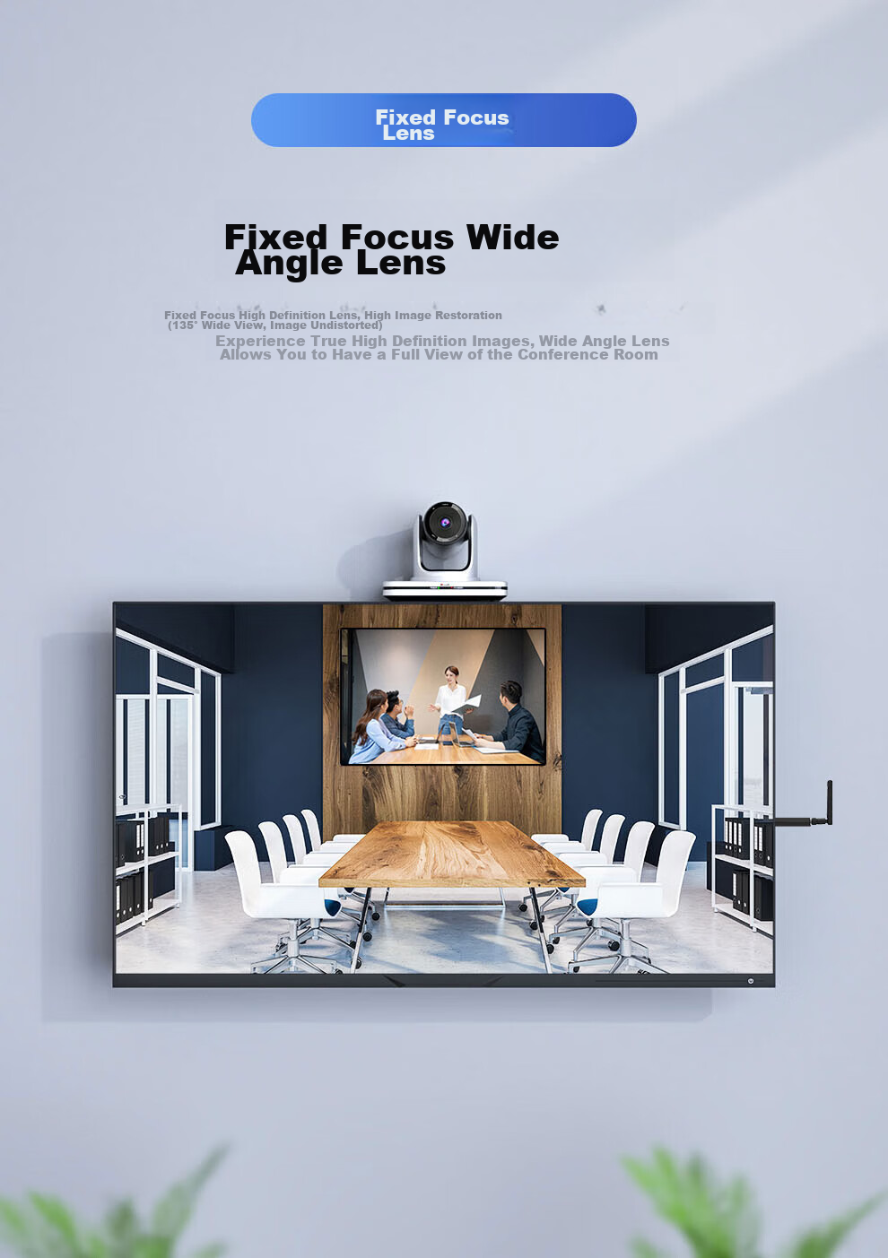 **Lens:** Fixed focus wide-angle lens, high-definition lens, high image restoration (135° wide view, distortion-free image), providing a true high-definition image with a wide-angle view of the meeting room.