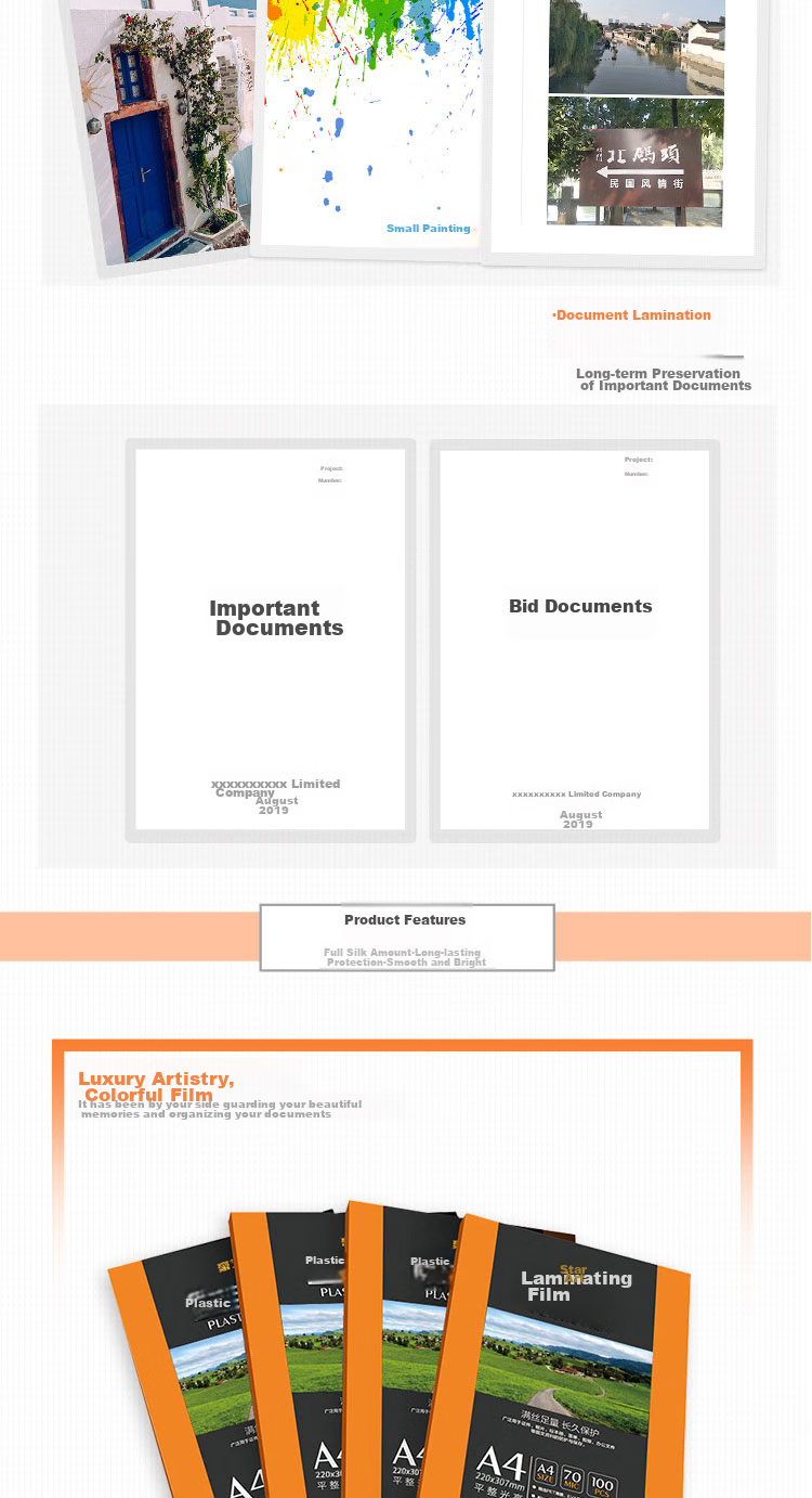**Application:** Widely used for laminating IDs, work permits, driver's licenses, student IDs, representative IDs, marriage certificates, photos, business cards, menus, texts, homework guides, children's drawings, documents, and drawings.